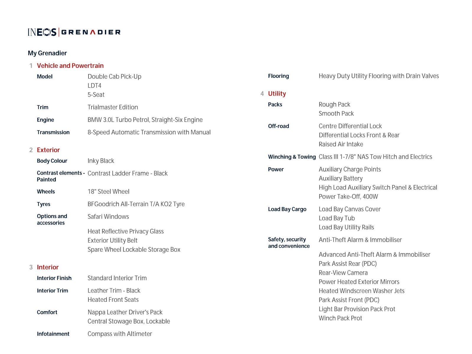 Inky Black 2025 INEOS Grenadier Quartermaster Quartermaster Trialmaster Double Cab Pick-Up 4WD 8-Speed Automatic 3.0L I6 18" Steel Wheels, 400W Power Take-Off, ABS brakes, BFGoodrich All-Terrain KO2 Tire, Class III 2" NAS Tow Hitch & Electrics, Compass w/Altimeter, Electronic Stability Control, Exterior Utility Belt, Front & Rear Differential Locks, Heat Reflective Privacy Glass, Heated door mirrors, Heated Front Bucket Seats, Illuminated entry, Leather Seat Trim, Load Bay Liner, Lockdown Security Cable, Low tire pressure warning, Raised Air Intake, Remote keyless entry, Rough Pack w/18" Wheels, Safari Windows, Traction control.